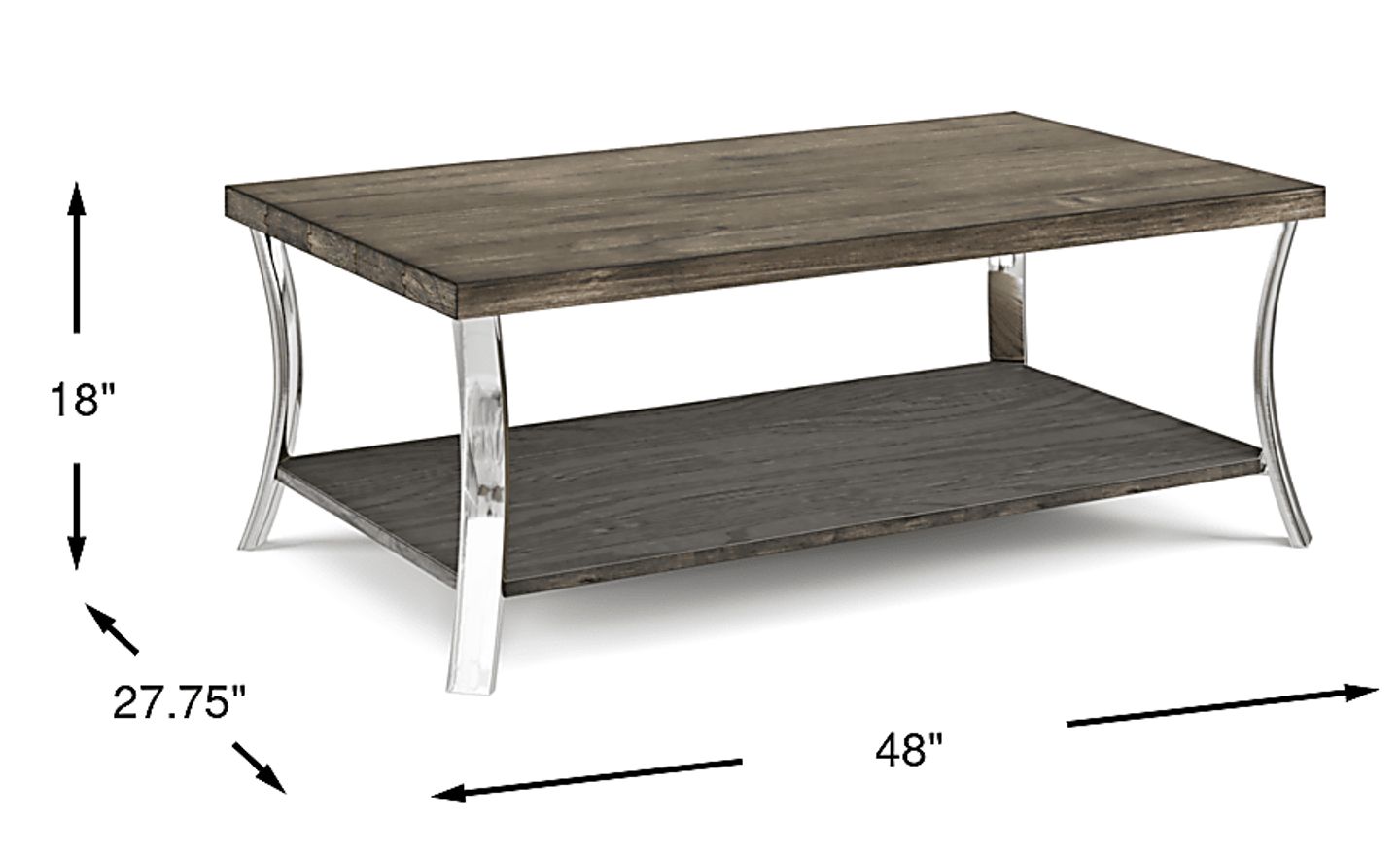 Perfect for entertaining, the Arland rectangular cocktail table boasts an industrial contemporary appeal. With a spacious tabletop and a lower shelf for added storage, the cocktail table features clean lines and sharp edges that enhance its modern feel. This table showcases a chic brown finish. Curved metal legs add a touch of futuristic chrome hardware to the piece.