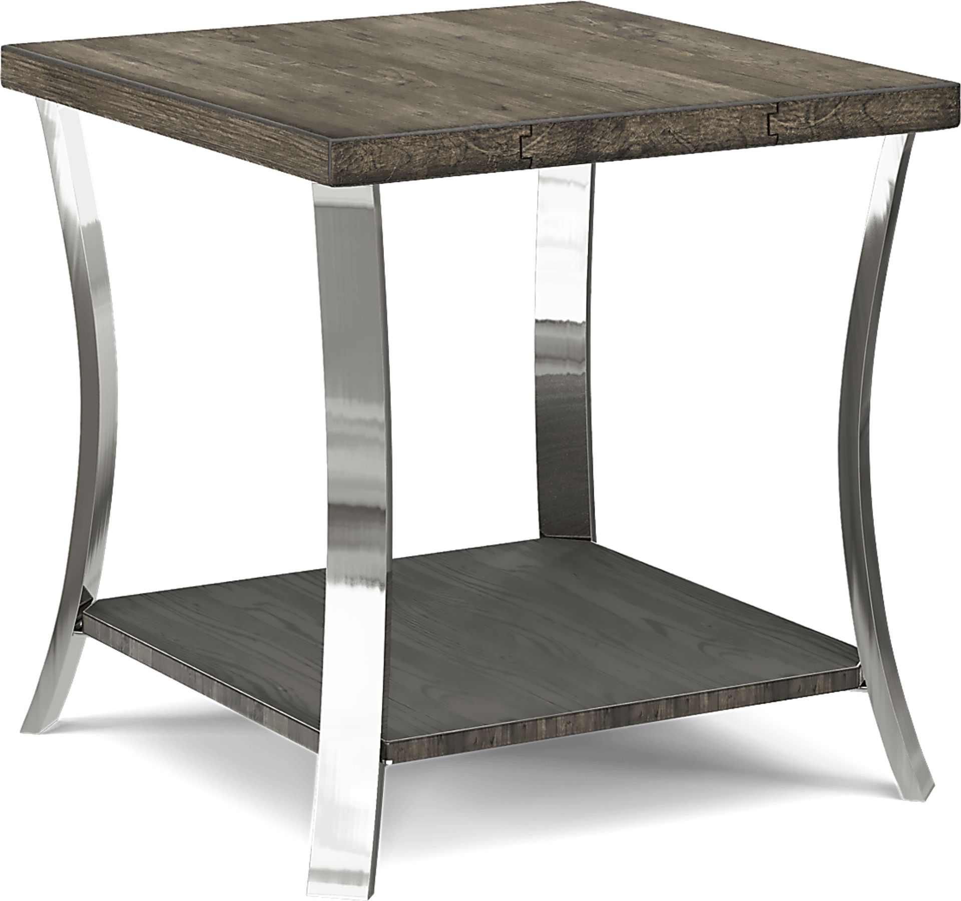 Offering industrial style for your living space, the Arland square end table fosters a true contemporary look. This table's combination of clean lines and sharp edges create an attractive modern design. Crafted of red oak and birch wood solids, the end table is both modern and natural. A brown finish creates a warm tone, while the curved metal legs add a touch of futuristic chrome hardware to the piece. For additional storage space, this end table features a lower shelf.