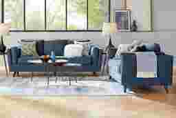 Whether you're taking it easy on the days that end in "y" or enjoying quality time with family and friends, the Drew & Jonathan Arlington collection fashions your living room with heartwarming style everyone will love. Upholstered with chenille fabric, each piece features tuxedo arms and loose bolster pillows that balance the richly layered profile with chic, cozy comfort. Handsome welted seams on the plush cushions tailor the appearance with sophisticated charm, while accent pillows supply the denim color of the sofa and loveseat with midcentury modern flair. Tapered legs in brown finish ground the look with an irresistible final contrast. An XL queen size Sealy Royale mattress can be pulled out to create a comfortable guest suite for overnight company. Upholstery: 100% Polyester. Cleaning Instructions: Use water based cleaning agents or foam. Lamps not as shown in room image. Small accent pillows not included.