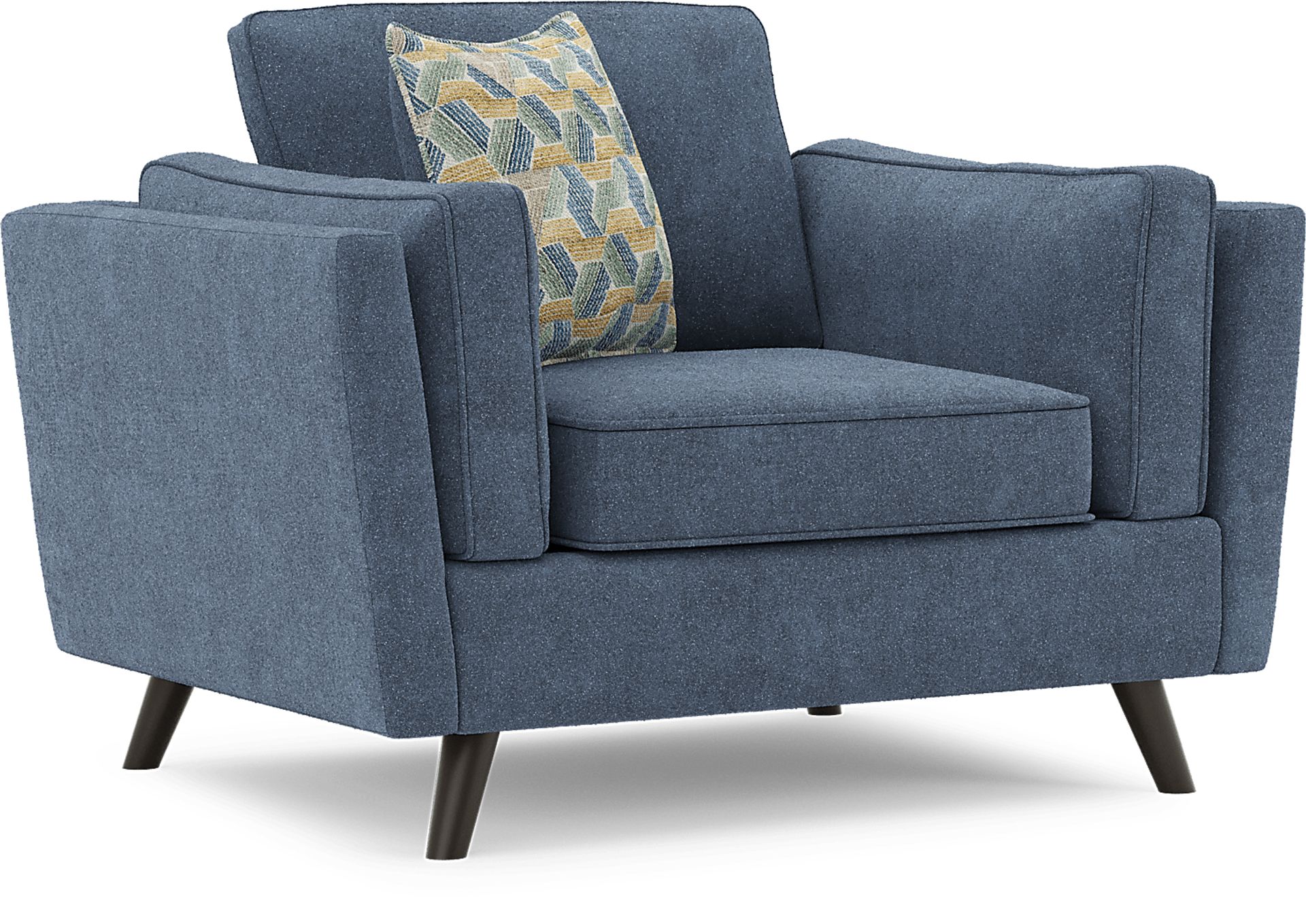 Whether you're taking it easy on the days that end in "y" or enjoying quality time with family and friends, the Drew & Jonathan Arlington chair fashions your living room with heartwarming style everyone will love. Upholstered with chenille fabric, this piece features tuxedo arms and loose bolster pillows that balance the richly layered profile with chic, cozy comfort. Handsome welted seams on the plush cushion tailors the appearance with sophisticated charm, while an accent pillow supplies the denim color of the chair with midcentury modern flair. Tapered legs in brown finish ground the look with an irresistible final contrast. Upholstery:100% Polyester.