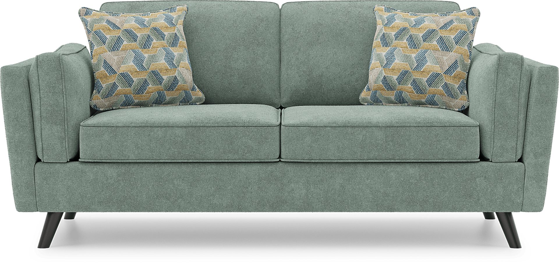 Whether you're taking it easy on the days that end in "y" or enjoying quality time with family and friends, the Drew & Jonathan Arlington loveseat fashions your living room with heartwarming style everyone will love. Upholstered with chenille fabric, this piece features tuxedo arms and loose bolster pillows that balance the richly layered profile with chic, cozy comfort. Handsome welted seams on the plush cushions tailor the appearance with sophisticated charm, while accent pillows supply the seafoam color of the loveseat with midcentury modern flair. Tapered legs in brown finish ground the look with an irresistible final contrast. Upholstery:100% Polyester.