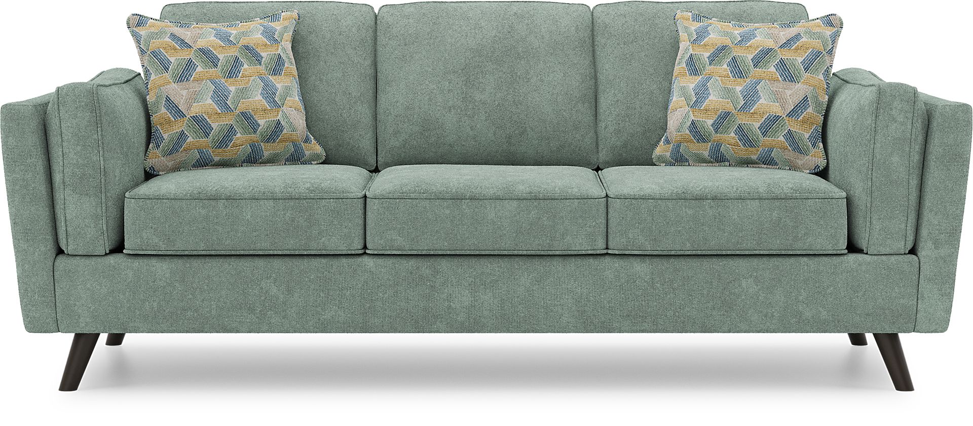 Whether you're taking it easy on the days that end in "y" or enjoying quality time with family and friends, the Drew & Jonathan Arlington sofa fashions your living room with heartwarming style everyone will love. Upholstered with chenille fabric, this piece features tuxedo arms and loose bolster pillows that balance the richly layered profile with chic, cozy comfort. Handsome welted seams on the plush cushions tailor the appearance with sophisticated charm, while accent pillows supply the seafoam color of the sofa with midcentury modern flair. Tapered legs in brown finish ground the look with an irresistible final contrast. Upholstery:100% Polyester.
