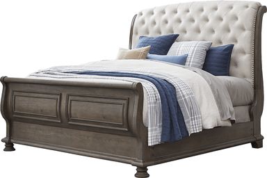 Intricately designed with hints of stunning 18th century architecture, the Armitage bed offers exemplary traditional style for your space. Crafted with pecan veneers in a dark brown finish, the bed features beige upholstery on the headboard with stylish button-tufting details and a sleigh-style footboard. Outwardly canted bun feet offer the perfect final detail for this bed's sophisticated look. Mattress and foundation (if required) sold separately.