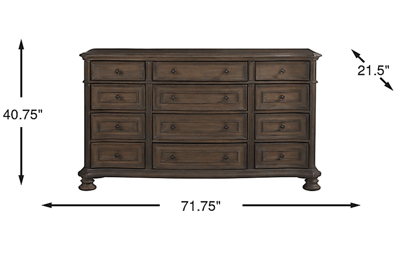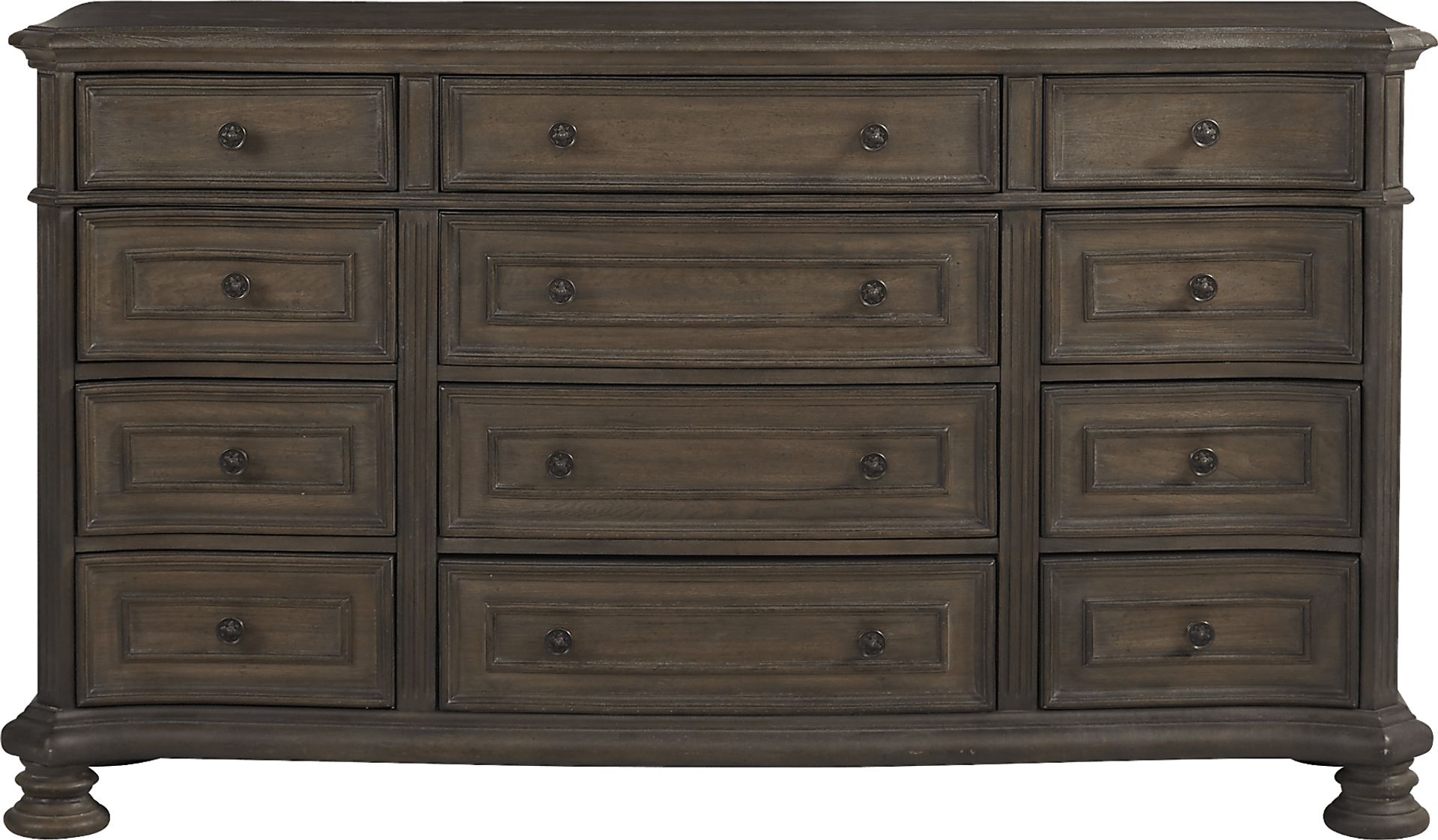 Intricately designed with hints of stunning 18th century architecture, the Armitage dresser offers exemplary traditional style for your space. Crafted of poplar solids and pecan veneers in a dark brown finish, this 12-drawer dresser features solid wood framing with reinforced corner blocks and ball bearing glides for increased strength and stability. Each drawer is configured with English dovetail fronts and French dovetail backs with plenty of room to store clothes, personal effects and more. Dark cast knob hardware and outwardly canted bun feet offer the perfect final details for this dresser's sophisticated look.