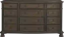 Intricately designed with hints of stunning 18th century architecture, the Armitage dresser offers exemplary traditional style for your space. Crafted with pecan veneers in a dark brown finish, this 12-drawer dresser features solid wood framing with reinforced corner blocks and ball bearing glides for increased strength and stability. Each drawer is configured with English dovetail fronts and French dovetail backs with plenty of room to store clothes, personal effects and more. Dark cast knob hardware and outwardly canted bun feet offer the perfect final details for this dresser's sophisticated look.