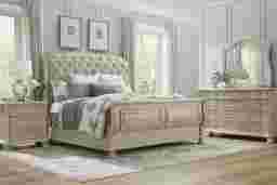 Intricately designed with hints of stunning 18th century architecture, the Armitage bedroom offers exemplary traditional style for your space. Crafted of poplar solids and pecan veneers in an off-white finish, the bed features beige upholstery on the headboard with stylish button-tufting details and a sleigh-style footboard with outwardly canted bun feet. The 12-drawer dresser has solid wood framing with reinforced corner blocks and is configured with ball bearing glides for enhanced strength and stability. A pair of nightstands with double USB charging ports, a hidden storage compartment and a nightlight offer ample bedside storage for personal effects. The coordinating mirror completes this room's sophisticated look.
