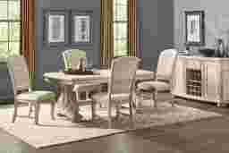 Intricate designs with the grandeur and pageantry of centuries past make the Armitage dining room a luxurious addition for an elegant night's in. Crafted of wood solids with pecan veneers in an off-white finish, this traditional table features ornate details in the base while the tabletop uses an 18-inch leaf to extend the table to 96 inches for guest accommodations.