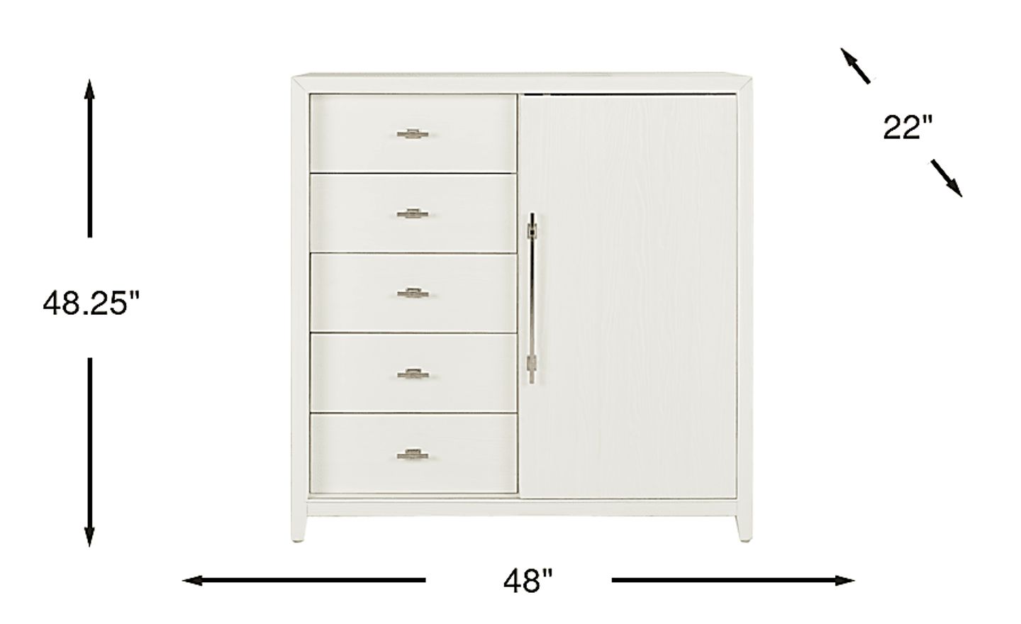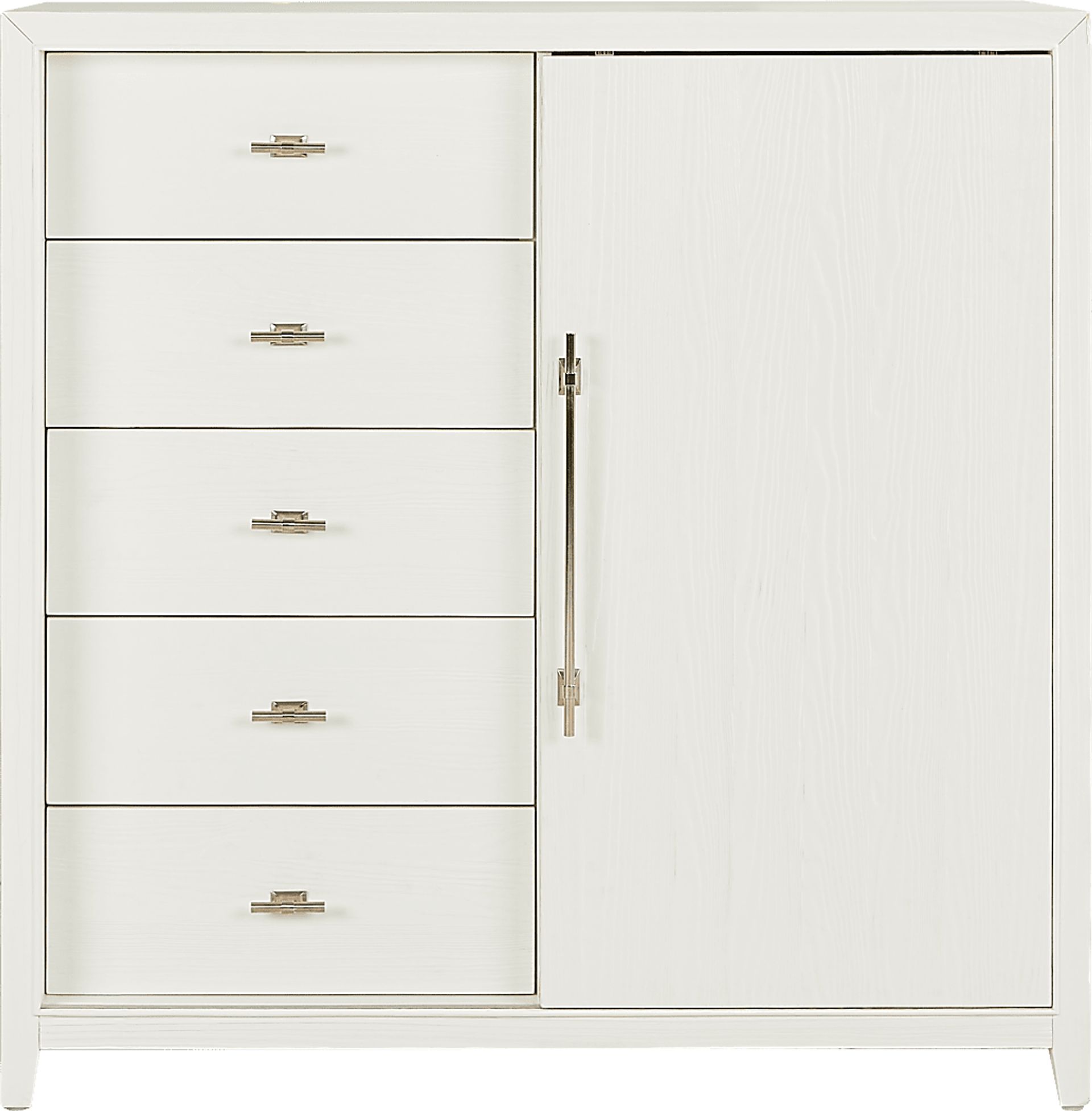 With the softness of a sun-warmed breeze and the natural grace of a rustling fan of palm leaves, the Aruba collection's subtle notes of beachy style brighten your world every day. This modern gentleman's chest is crafted of pine veneers in a white finish and showcases a handsome square frame. Designed for versatility, five drawers and a sliding door that reveals spacious shelving offer ample room to organize and store your bedroom essentials. Elongated metal pulls in a nickel finish completes the look with a sophisticated touch.