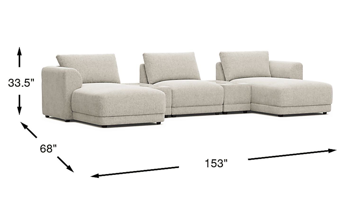 The story of your space is waiting to unfold, its memories, laughs, movie nights and great times, all with the Drew & Jonathan ModularFour living room as the setting you configure to bring it to life. This customizable contemporary seating solution features individual pieces that can be reconfigured endlessly to the shape you need. All-sides upholstery in ash gray chenille offers modern style and comfort at every angle while large, rounded wedge arms invite long sessions of indulgent relaxation. Effortlessly tailor your seating arrangement for everything from game days to sleepovers to everyday relaxation with easy-to-use connectors for rock solid stability. The included media consoles feature integrated Bluetooth sound, USB-A and USB-C charging, and can connect with up to 5 additional media consoles for an incredible surround-sound experience. Includes left arm chaise, two media consoles, armless chair and right arm chaise. Visit a showroom to learn more about individual components and to work with a sales specialist to customize your own configuration today. Upholstery: 100% Polyester.
