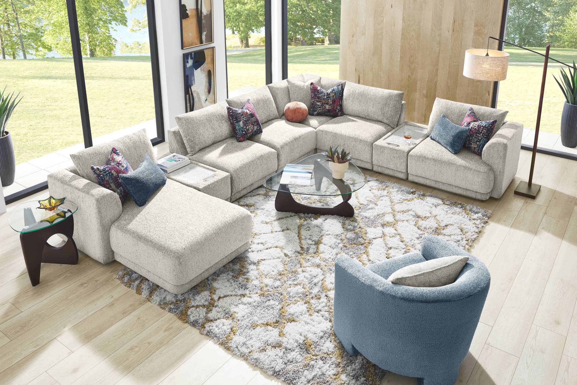 The story of your space is waiting to unfold, its memories, laughs, movie nights and great times, all with the Drew & Jonathan ModularFour living room as the setting you configure to bring it to life. This customizable contemporary seating solution features individual pieces that can be reconfigured endlessly to the shape you need. All-sides upholstery in ash gray chenille offers modern style and comfort at every angle while large, rounded wedge arms invite long sessions of indulgent relaxation. Effortlessly tailor your seating arrangement for everything from game days to sleepovers to everyday relaxation with easy-to-use connectors for rock solid stability. The included media consoles feature integrated bluetooth-enabled speakers, USB-A and USB-C charging, and can connect with up to 5 additional media consoles for an incredible surround-sound experience. Includes left arm chaise, two media consoles, three armless chairs, wedge and right arm chair. Visit a showroom to learn more about individual components and to work with a sales specialist to customize your own configuration today. Upholstery: 100% Polyester.