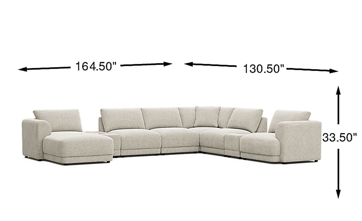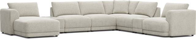 The story of your space is waiting to unfold, its memories, laughs, movie nights and great times, all with the Drew & Jonathan ModularFour living room as the setting you configure to bring it to life. This customizable contemporary seating solution features individual pieces that can be reconfigured endlessly to the shape you need. All-sides upholstery in ash gray chenille offers modern style and comfort at every angle while large, rounded wedge arms invite long sessions of indulgent relaxation. Effortlessly tailor your seating arrangement for everything from game days to sleepovers to everyday relaxation with easy-to-use connectors for rock solid stability. The included consoles feature integrated USB-A and USB-C charging for ultimate convenience. Includes left arm chaise, two consoles, three armless chairs, wedge and right arm chair. Visit a showroom to learn more about individual components and to work with a sales specialist to customize your own configuration today. Upholstery: 100% Polyester.