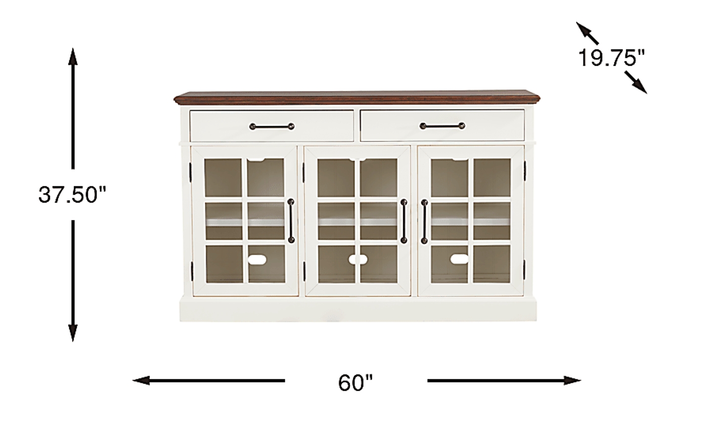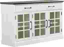 Soft, gentle light drifts across a weathered finish as the Ashlyn Lake collection awakens quiet reflection that eases the day, its timeless charm and enduring beauty the perfect antidote to hustle and flow. Crafted in a warm, two-tone finish, this traditional credenza features a rich, brown top and a crisp white base for a look that feels both classic and refreshed. Framed glass doors with windowpane detailing reveal spacious shelving that's perfect for organizing or displaying decorative accents. Wire management holes on the back provide a clean, clutter free setup. Two top drawers offer additional storage for essentials, while antique-inspired hardware in black brings a touch of relaxed sophistication.