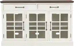 Soft, gentle light drifts across a weathered finish as the Ashlyn Lake collection awakens quiet reflection that eases the day, its timeless charm and enduring beauty the perfect antidote to hustle and flow. Crafted in a warm, two-tone finish, this traditional credenza features a rich, brown top and a crisp white base for a look that feels both classic and refreshed. Framed glass doors with windowpane detailing reveal spacious shelving that's perfect for organizing or displaying decorative accents. Wire management holes on the back provide a clean, clutter free setup. Two top drawers offer additional storage for essentials, while antique-inspired hardware in black brings a touch of relaxed sophistication.