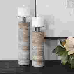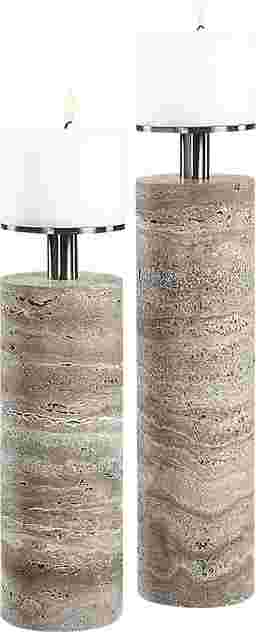 Illuminate your space with sophistication using these cylinders of unfilled gray travertine featuring dark bronze metal candle cups. Crafted for elegance and durability, these Askio candleholders add a touch of refined ambiance to any room. Since it is a natural stone, each piece of travertine is unique.