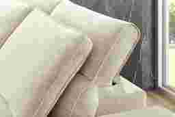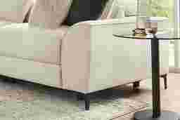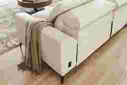 The calm, welcoming warmth of an upscale mountain lodge comes home with the Aspen collections inviting textures, soft hues, and plush comfort. Upholstered in soft, knitted beige fabric, this modern sectional features flare arms, welted seams, and reversible pillow-style back cushions that bring softness and structure into balance. Dual power reclining allows for personalized relaxation with adjustable headrests, footrests, and a lift chaise for full-body support. A discreet control panel with built-in USB-A and USB-C ports keeps devices charged without interrupting the flow. Sleek legs finished in black lift the piece with a graceful touch. Upholstery: 100% Polyester. Cleaning Instructions: Use water-based cleaning agents or foam.