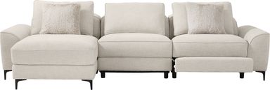 The calm, welcoming warmth of an upscale mountain lodge comes home with the Aspen collections inviting textures, soft hues, and plush comfort. Upholstered in soft, knitted beige fabric, this modern sectional features flare arms, welted seams, and reversible pillow-style back cushions that bring softness and structure into balance. Dual power reclining allows for personalized relaxation with adjustable headrests, footrests, and a lift chaise for full-body support. A discreet control panel with built-in USB-A and USB-C ports keeps devices charged without interrupting the flow. Sleek legs finished in black lift the piece with a graceful touch. Upholstery: 100% Polyester. Cleaning Instructions: Use water-based cleaning agents or foam.