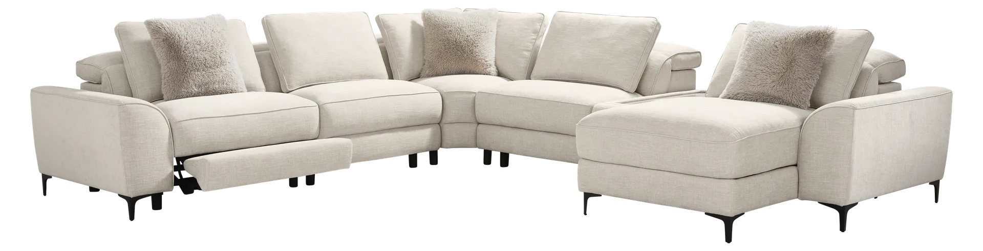 The calm, welcoming warmth of an upscale mountain lodge comes home with the inviting textures, soft hues and plush comfort of Cindy Crawford Home's Aspen collection. Upholstered in soft, knitted sand-tone fabric, this modern sectional features flare arms, welted seams and reversible pillow-style back cushions that bring softness and structure into perfect balance. A dual power recliner on the right end of the piece allows for personalized relaxation with power-adjustable headrests and footrests. The left-facing lift chaise delivers full-body contouring comfort and support. A discreet control panel with built-in USB-A and USB-C ports keeps devices charged without interrupting the flow. Sleek legs finished in black lift the piece with a graceful touch. Upholstery: 100% Polyester