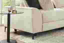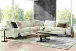 The calm, welcoming warmth of an upscale mountain lodge comes home with the Aspen collections inviting textures, soft hues, and plush comfort. Upholstered in soft, knitted beige fabric, this modern sectional features flare arms, welted seams, and reversible pillow-style back cushions that bring softness and structure into balance. Dual power reclining allows for personalized relaxation with adjustable headrests and footrests. A discreet control panel with built-in USB-A and USB-C ports keeps devices charged without interrupting the flow. Sleek legs finished in black lift the piece with a graceful touch. Upholstery: 100% Polyester.