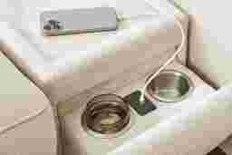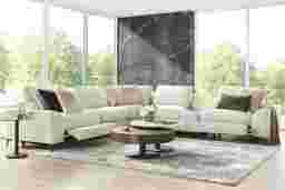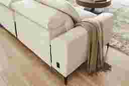 The calm, welcoming warmth of an upscale mountain lodge comes home with the Aspen collections inviting textures, soft hues, and plush comfort. Upholstered in soft, knitted beige fabric, this modern sectional features flare arms, welted seams, and reversible pillow-style back cushions that bring softness and structure into balance. Dual power reclining allows for personalized relaxation with adjustable headrests and footrests. A discreet control panel with built-in USB-A and USB-C ports keeps devices charged without interrupting the flow. The included media console offers an acrylic top to hold decor or books effortlessly, while the front pulls out to reveal integrated USB ports and stainless-steel cup holders. Sleek legs finished in black lift the piece with a graceful touch. Upholstery: 100% Polyester. Cleaning Instructions: Use water-based cleaning agents or foam.