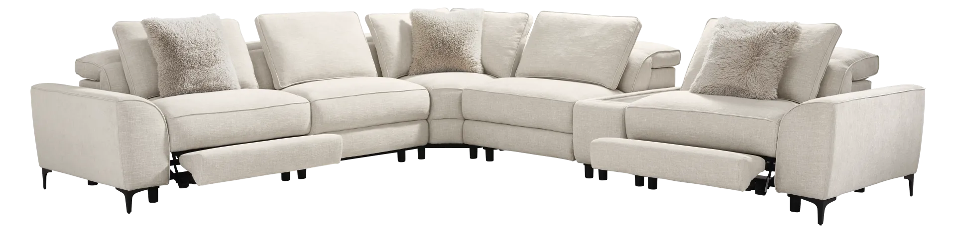The calm, welcoming warmth of an upscale mountain lodge comes home with the Aspen collections inviting textures, soft hues, and plush comfort. Upholstered in soft, knitted beige fabric, this modern sectional features flare arms, welted seams, and reversible pillow-style back cushions that bring softness and structure into balance. Dual power reclining allows for personalized relaxation with adjustable headrests and footrests. A discreet control panel with built-in USB-A and USB-C ports keeps devices charged without interrupting the flow. The included media console offers an acrylic top to hold decor or books effortlessly, while the front pulls out to reveal integrated USB ports and stainless-steel cup holders. Sleek legs finished in black lift the piece with a graceful touch. Upholstery: 100% Polyester. Cleaning Instructions: Use water-based cleaning agents or foam.