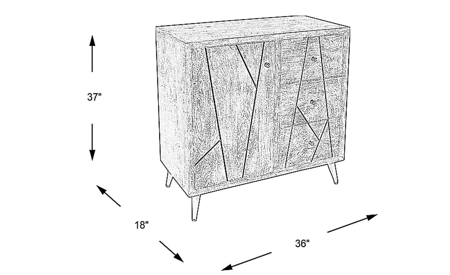 Combining grounded style with airy contrast, the Asphite cabinet adds an air of cosmopolitan sophistication to any space. Eye-catching angular inlays across the face of this cabinet are outlined in a bright silver metal that's the same finish as the knobs and legs. In true transitional style, the mango wood of the body is finished in a dark sandblasted gray, lightly exposing the woodgrain for a casual distressed look. Three deep drawers and a tall divided cabinet complete this piece.