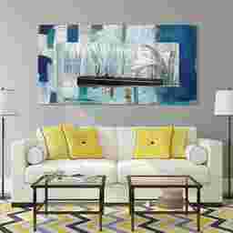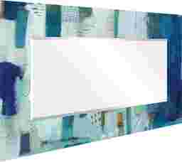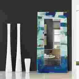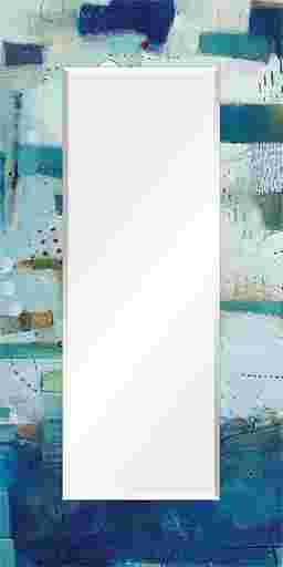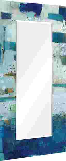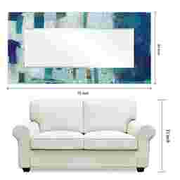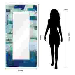This stunning Asriel, frameless, free-floating tempered glass mirror is the perfect addition for any room where a 6 ft tall mirror is preferred. This specific mirror places a large rectangular mirror over beautiful abstract art of different shades of blue. The mirror in the middle is 55"x 20" with a 0.7" beveled edge. Four strong steel hangers are attached to the back of the mirror for quick and easy installation either vertically or horizontally.