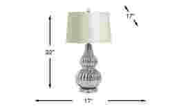 A testament to contemporary design, the Asterion table lamp features a gourd inspired shape with a crystal base. Topped with an ivory drum shade, this lamp can accommodate one 3-way switch, 100 watt bulb (not included).