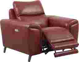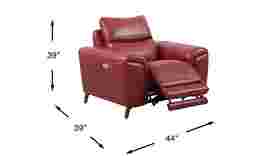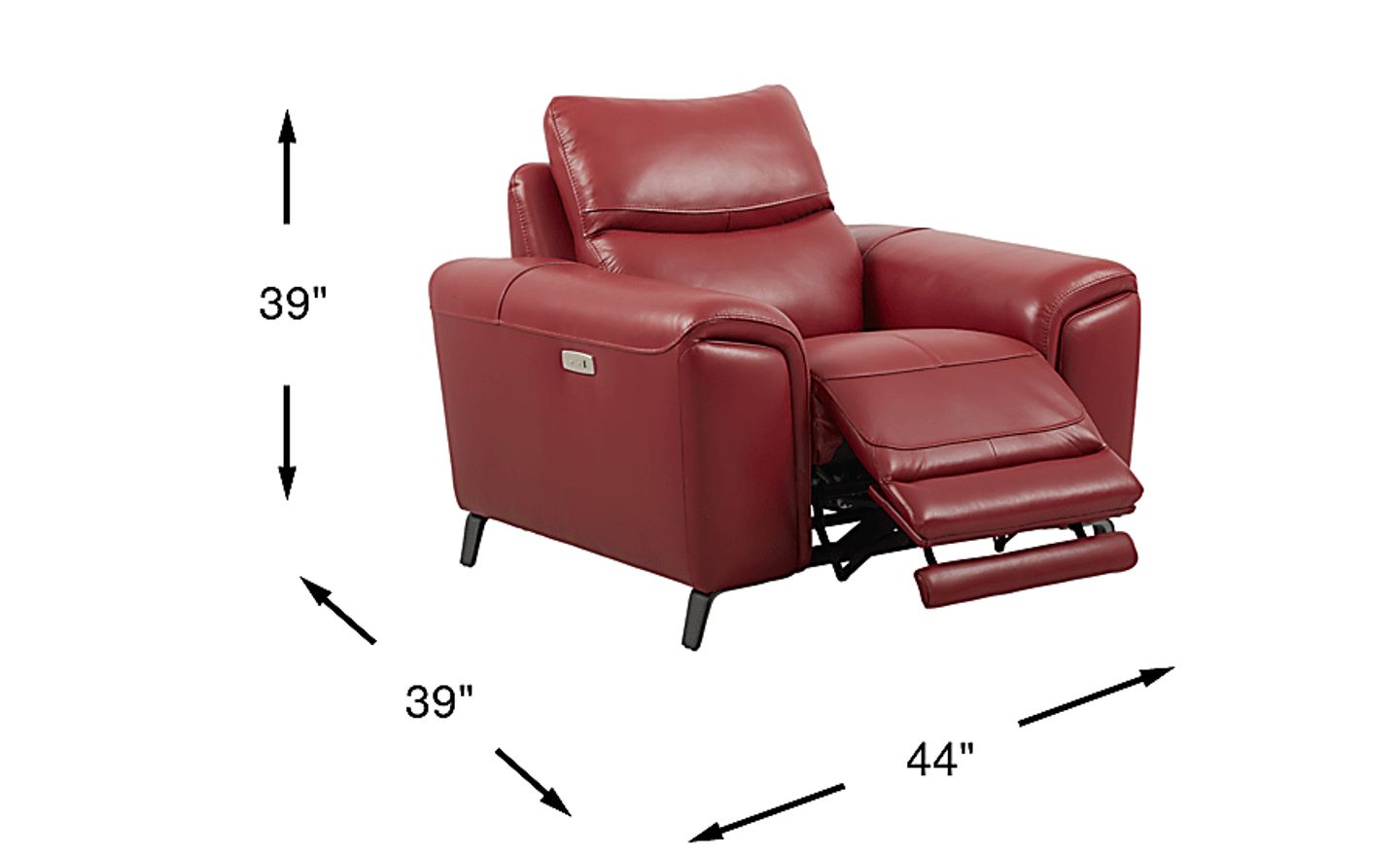 No ordinary recliner, the Astoria Heights power recliner takes relaxation to the next level. Luxurious top grain leather wherever the body touches is supple to the touch and rendered in a bold red color. The power padover chaise footrest can be raised and lowered at the touch of a button to create your perfect position. A handy USB port keeps mobile devices charged. Decorative top stitching detail adds a quality touch while metal legs provide stylish contemporary support. Top Grain Leather Where The Body Touches and Vinyl sides and backs.