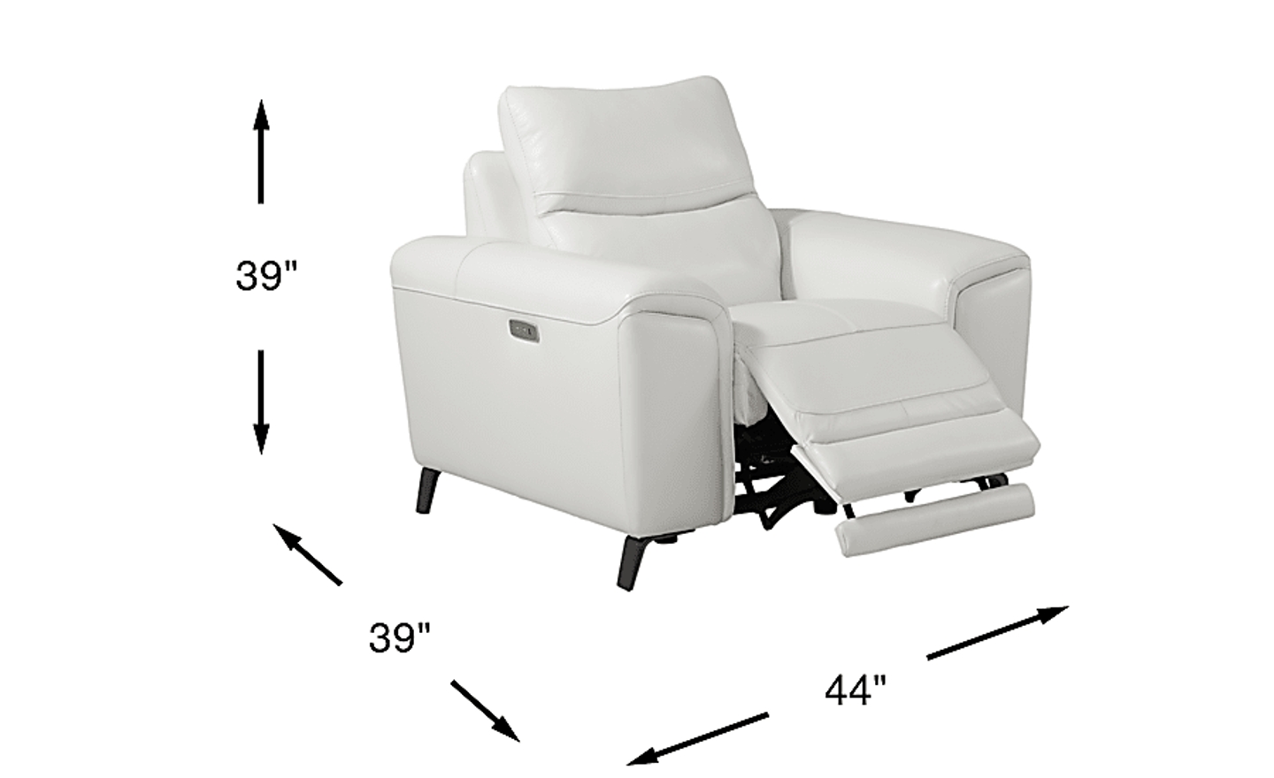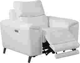 No ordinary recliner, the Astoria Heights power recliner takes relaxation to the next level. Luxurious top grain leather wherever the body touches is supple to the touch and rendered in a fresh white color. The power padover chaise footrest can be raised and lowered at the touch of a button to create your perfect position. A handy USB port keeps mobile devices charged. Decorative top stitching detail adds a quality touch while metal legs provide stylish contemporary support. Top Grain Leather Where The Body Touches and Vinyl sides and backs.