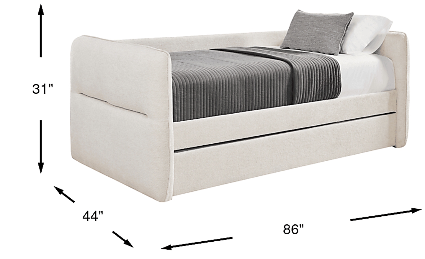 Spontaneous sleepovers and laid-back lounging become effortless and elegant with the Audra Place collection's calming curves, plush textures and versatile features, creating easy unwinding and serene comfort. Featuring a contemporary upholstered design with beige woven fabric, this daybed's rounded edges and subtle tufting offer a cozy yet sophisticated look. When you give the front rail a little tug, out glides the twin trundle that's ready to accommodate overnight guests or further your everyday relaxation. Upholstery: 100% polyester. Mattress and foundation (if required) sold separately.