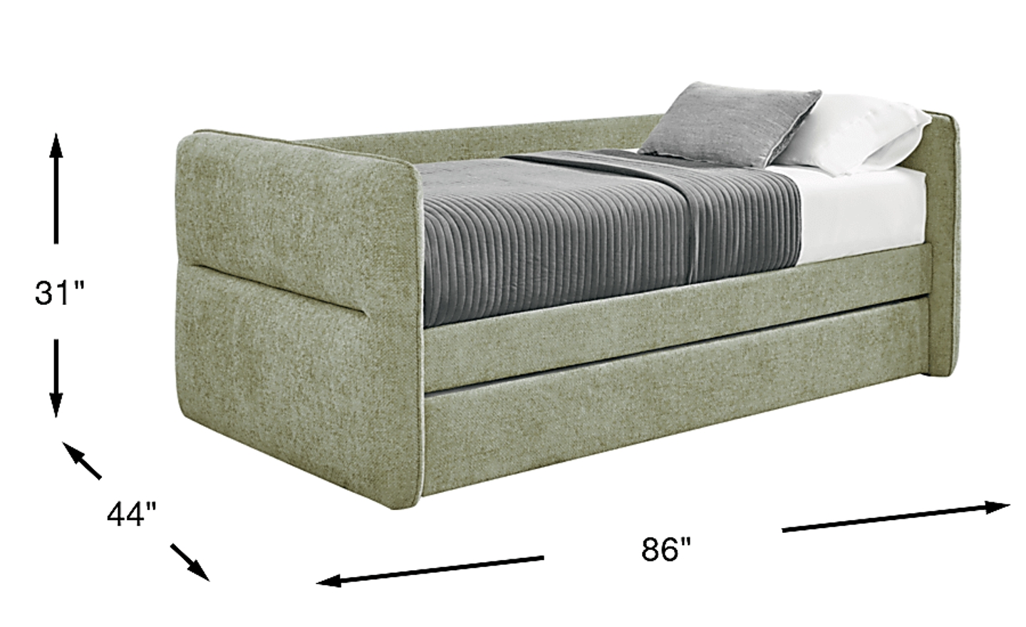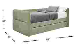 Spontaneous sleepovers and laid-back lounging become effortless and elegant with the Audra Place collection's calming curves, plush textures and versatile features, creating easy unwinding and serene comfort. Featuring a contemporary upholstered design with green woven fabric, this daybed's rounded edges and subtle tufting offer a cozy yet sophisticated look. When you give the front rail a little tug, out glides the twin trundle that's ready to accommodate overnight guests or further your everyday relaxation. Upholstery: 100% polyester. Mattress and foundation (if required) sold separately.