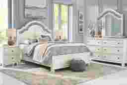 More than just a bed, the Augustine collection unveils a retreat where the world fades away and you're left surrounded by soulful warmth, effortless charm and an elegance that feels eternal. The headboard's eye-catching arch instantly draws you in with its graceful silhouette, setting the tone for the for a traditional, yet timeless, look. Crafted in a rich, white ivory-brush glaze finish, the king panel bed's ornate carvings play alongside resin moldings for an utterly enchanting look. Mattress and foundation (if required) sold separately.