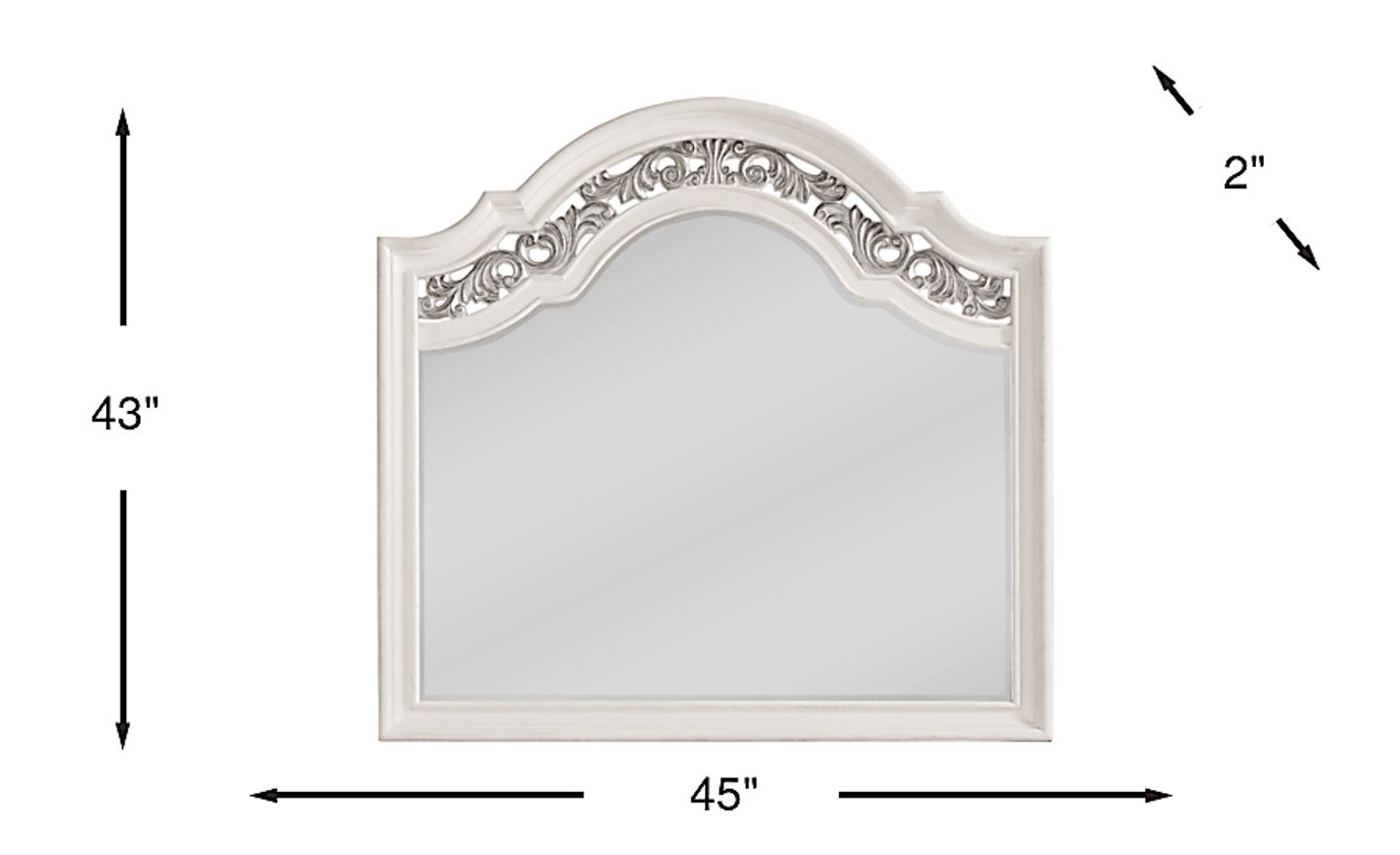 Utter enchantment meets soulful warmth, effortless charm and an abundance of elegance in the stunning Augustine mirror. The piece's eye-catching arch instantly draws you in with its graceful silhouette, setting the tone for a sophisticated bedroom collection. Crafted in a rich, white ivory-brush glaze finish, look features ornate carvings that play alongside resin moldings.