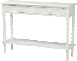 Timeless grace arrives to unify your interior through the beautiful Aurich white sofa table. This classic piece is crafted from sturdy wood. Two drawers offer convenient storage for household essentials, while reserving the open shelf and tabletop as lovely display areas. The Aurich utilizes spindle legs with ring-turned embellishments for a captivating presentation from any angle. Round drawer knobs accentuate the piece with smooth geometry, making the Aurich an elegant fixture. Customer assembly is required.