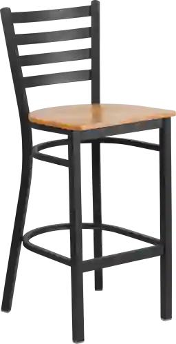 The Averil barstool with a black ladder back and natural wood seat will be an attractive addition to your bar, lounge, or game room at home. The chair features an 18 gauge steel frame in an attractive ladder back design with a welded joint assembly. Two curved support bars give the chair great strength and durability as well as a built-in footrest. Plastic floor glides protect your floors by sliding smoothly when you need to move the stool.This metal restaurant chair is a commercial grade chair that would also look great in your home. Customer assembly is required.