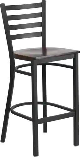 The Averil barstool with a black ladder back and walnut wood seat will be an attractive addition to your bar, lounge, or game room at home. The chair features an 18 gauge steel frame in an attractive ladder back design with a welded joint assembly. Two curved support bars give the chair great strength and durability as well as a built-in footrest. Plastic floor glides protect your floors by sliding smoothly when you need to move the stool.This metal restaurant chair is a commercial grade chair that would also look great in your home. Customer assembly is required.