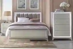 This bed is a centerpiece of contemporary glam design. To create a cohesive look, pair it with neutral tones like charcoal, white, or light gray, which allow the silver finish to pop. Incorporating mirrored furniture, such as the matching Avery Silver dresser or nightstand, can further enhance the reflective qualities of the room, making the entire space feel brighter and more luxurious.