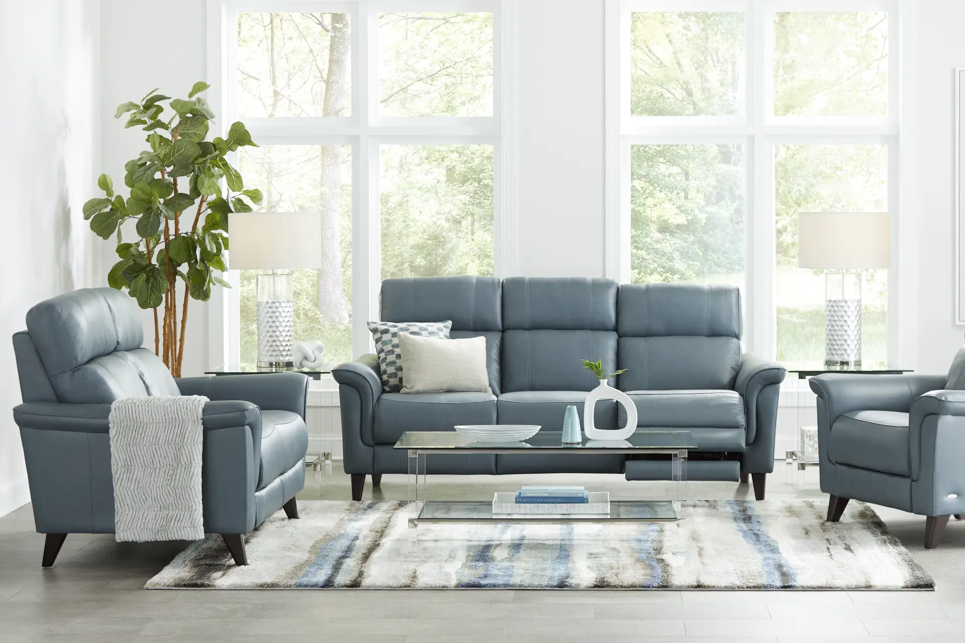 Chic design with modern appeal, the Avezzano living room embodies luxe comfort and styling. Upholstered in soft blue top grain leather where the body touches, the pieces of this sleek collection boast bustle back cushion design, as well as angled tapered legs for an elevated look. Both the love seat and sofa boast dual power reclining capabilities, allowing the headrests and footrests to be adjusted with the touch of a button. Upholstery: Top Grain Leather Where the Body Touches and Vinyl Sides and Backs. Leather is a durable, low maintenance product; however, general regular maintenance is necessary. To keep your leather clean, vacuum it regularly, removing any dust, and clean it with water and a mild non-detergent soap. Accent pillows not included.