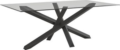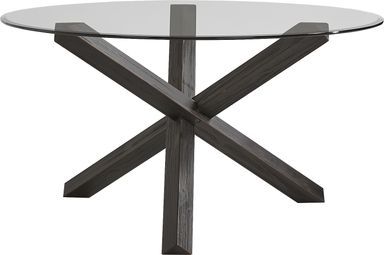 Introductions drift into easy conversation, and the Axia dining room's glassy surface holds that rhythm with a presence so light it melts into seamless moments of connection. The cris-crossed base comes in a black finish, standing out against the transparency of the 48-inch round tabletop. Four Emeric side chairs upholstered in gray microfiber fabric flank the beveled surface, their tapered legs in black poised and perfectly visible through the table.