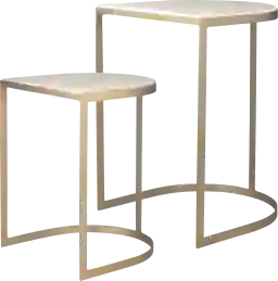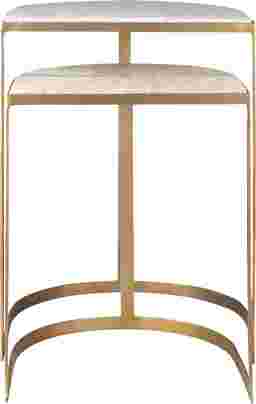 A sophisticated pair of Ayashe nesting tables featuring a curved metal strap frame in a refined gold finish and two elegant travertine tabletops. Customer assembly required.