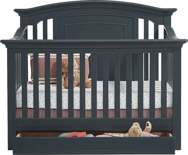 Classic style meets functionality in the Baby Cache Harborbridge navy crib. Constructed with assorted hardwoods for structural integrity, this convertible crib features a beautifully curved headboard as well as a simple applied molding detail. The crib's large bottom storage drawer is perfect for holding extra blankets and sheets, or all those tiny baby pajamas. Build on this classic design that will grow with your child by adding the toddler rail to covert the crib to a toddler bed and conversion rails to convert to a full bed. Crib and storage drawer included. Toddler rail and conversion rails are sold separately. Easily converts to toddler bed with toddler rails as an additional purchase. Easily converts to full bed with conversion rails as an additional purchase. Customer assembly required. Crib mattress and linens not included.