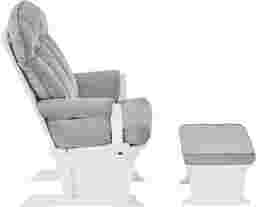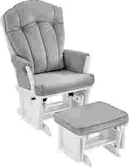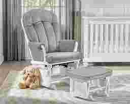 Perfect for rocking baby to sleep, watching TV, or reading, the Baby Cache Vanya light gray-white glider and ottoman offer an exceptionally smooth and extra-long glide motion with extra-plush cushions and padded arms. The polished, yet sumptuous curves of the glider and ottoman offer a toxic free finish that exceeds all mandated safety requirements. The combination of its contemporary design and white finish with light gray microfiber upholstery is the perfect complement to any room, including your baby's nursery. Customer assembly required. 100% polyester. Spot clean only.