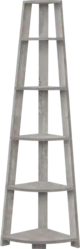 Set up the Backstretch gray bookcase easily and let it do its thing. Look how nice the bookcase fits in a corner of your living room, office or bedroom, allowing you to showcase books and all types of decor easily. Make use of a spot that is often tough to work with the corner. Maximize storage and display with a modern piece that will be sure to help you utilize all the space available to you thanks to the five fixed tray style shelves. Three sturdy beam legs ensure structural integrity to this corner ladder shelf in a gray finished, wood look texture. Anti-tipping hardware is included for further stability. Customer assembly is required.