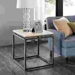 Beautifully crafted, the Baggett end table provides an eye-catching update to your decor. A rich cream marble tabletop is supported by a metal base with a gunmetal finish, creating a handsome look. Place this exquisite square end table in your living room to add a sophisticated touch to your decor. Customer assembly is required.