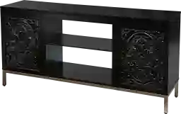 This stand offers a blend of style and utility with two spacious cabinets hidden behind carved wood doors. These enclosed compartments are perfect for neatly tucking away gaming consoles, movies, and controllers, helping to maintain a clutter-free environment. The carved detailing on the doors adds a sophisticated texture and visual depth that elevates the piece beyond standard storage furniture.