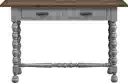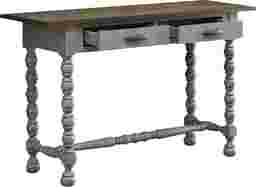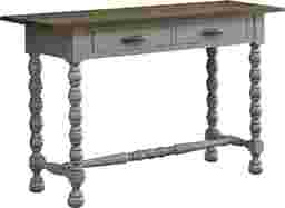 Curvy ball and spool legs, turned lower stretchers and a rich wood grained top are only some of the distinguishing features on this two drawer console. You will also love the soft gray finish and burnished metal hardware, and the look you will create when you place this in your home and add a vase of flowers and a photograph or two. Customer assembly required.