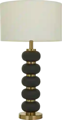The Baku Black Lamp is the perfect blend of modern allure and moody sophistication, its matte black, stone-like orbs stacked with sculptural confidence against warm, brushed-gold accents that feel rich and quietly glamorous. The soft, ivory shade glows like a calm evening sky, casting a warm light that softens the bold silhouette and fills your space with an inviting, upscale ambiance. It's a piece that feels both artistic and refined-simple in form, yet unforgettable in presence-adding depth, warmth, and contemporary elegance to any room it touches. Let its chic contrast and golden glow be the reason you bring it into your home. Partial assembly may be required.
