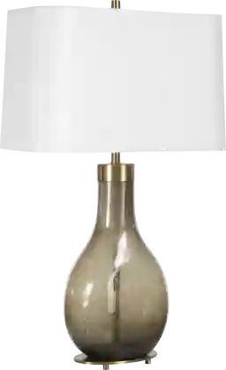 The Baldwin Farm Brown Lamp showcases a dark moss, heavily seeded teardrop glass base complemented by plated brushed brass accents. The slightly tapered oval hardback shade is covered in a timeless white linen fabric. Partial assembly may be required.