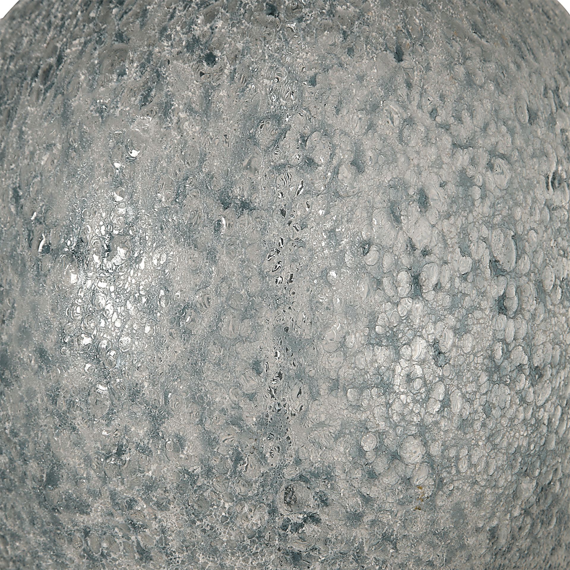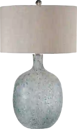 The finish on the Balliet Bay lamp is reminiscent to an ocean wave crashing, featuring mottled highlights of blue-green, covered in a heavily textured aged white glaze, paired with brushed nickel plated details. The round hardback drum shade is a light beige linen fabric with natural slubbing. Ideal for a nightstand or end table. Partial assembly may be required.