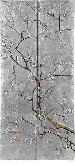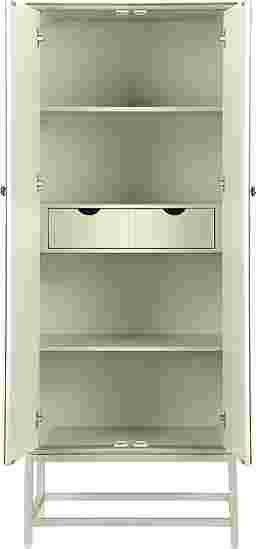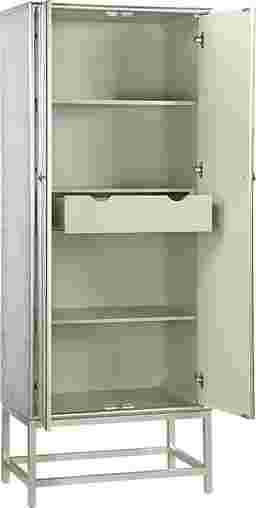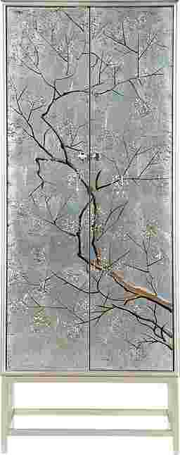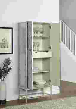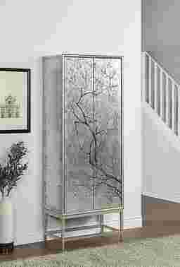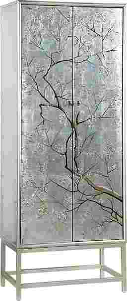 A vision of loveliness a piece of art worthy of a prominent position in your home this tall two door Balltrusol wine cabinet is all that and so much more. Finished in an enchanting silver featuring a silver leafing paired with reversed painted delicate branches that glide across the door fronts with an elegant grace. Inside you will find roomy shelves and a pull out drawer as well as places to store your stemware. A beautiful way to entertain your guests and accessorize your decor Customer assembly is required.
